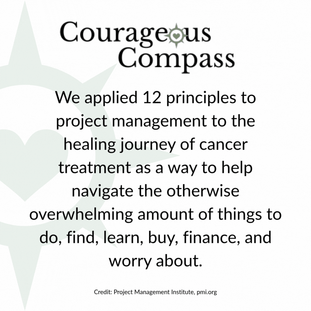 Applying the PMI Principles of Project Management and insights of fellow cancer survivors, the Courageous Compass Workbook is here to help you chart a course that works for you. This isn’t a one-size-fits-all guide, it’s a flexible framework designed to help you create a plan that fits your needs, values, and lifestyle.